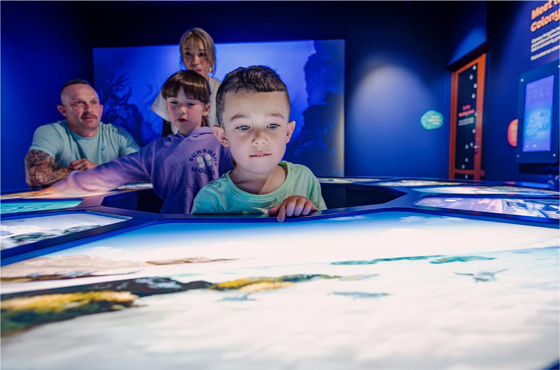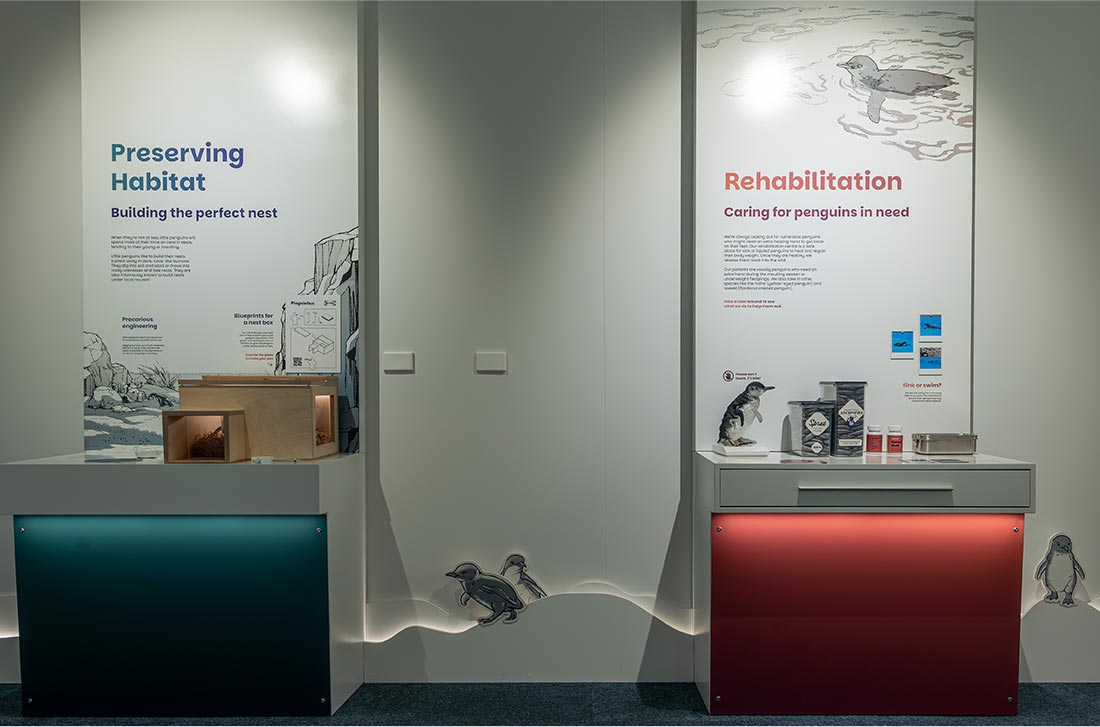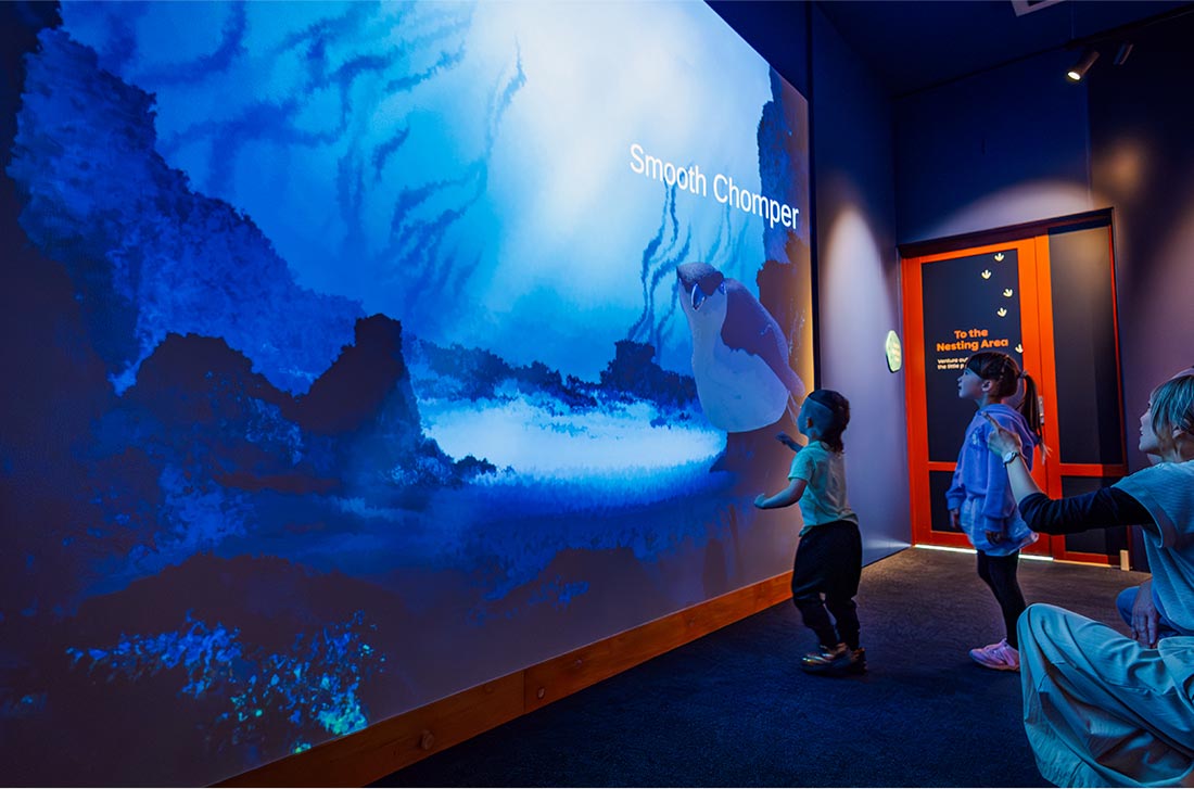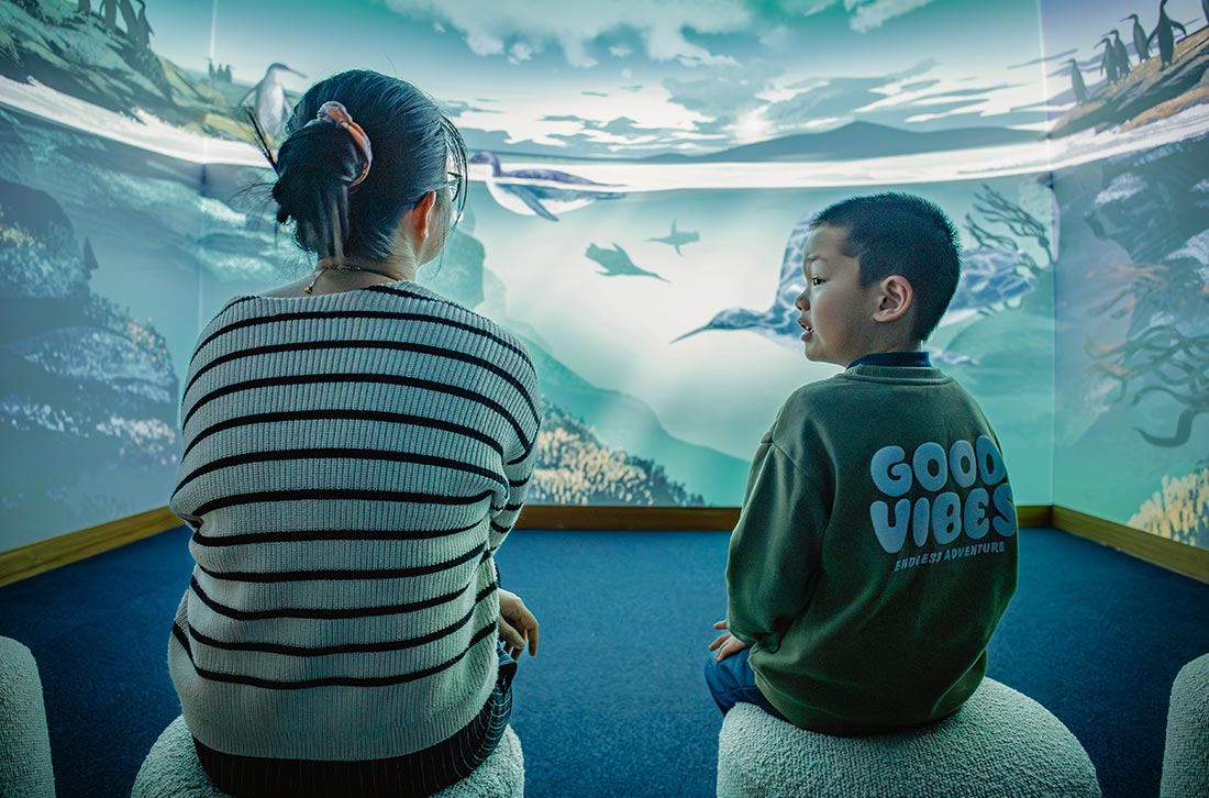 The experience begins with an immersive film exploring the long history of penguins in the Waitaki district, from prehistoric times to today. The film was developed entirely in-house, featuring bespoke illustrations, animation and a unique wrap-around format across three projections.