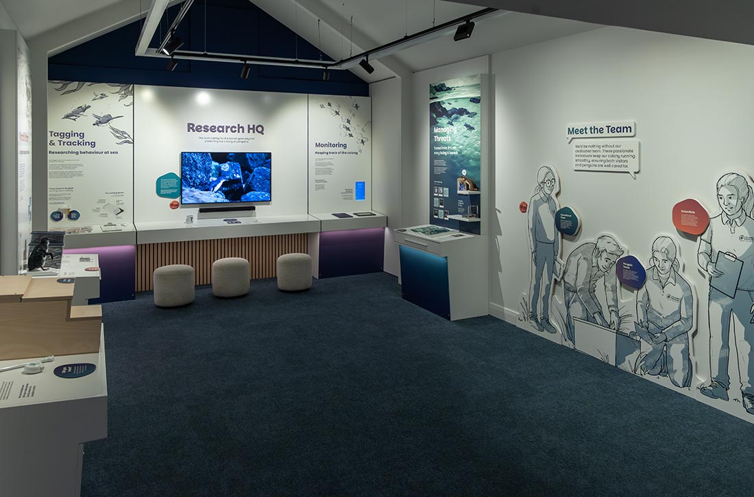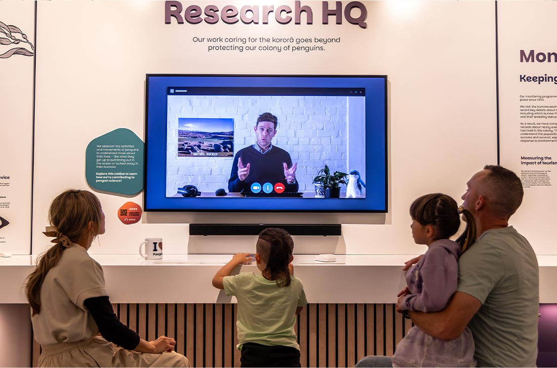 A key feature of the room is the ‘Research HQ’. This zone showcases the data collected by Ōamarvu Penguins and includes an interactive screen where visitors learn about the research work as if they’re on a video call with staff. By the end, visitors are fully inducted as honorary penguin scientists.