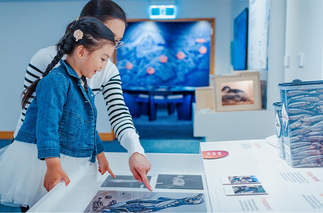 The first exhibition space focuses on the day-to-day scientific research and conservation work carried out by staff. Designed to feel like a science lab, the room features a clean lab-like look with hands-on activities.
