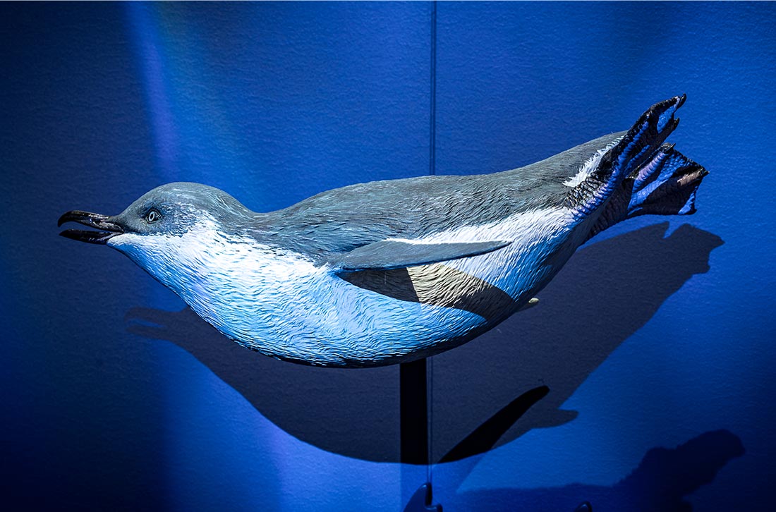The Penguin Room immerses visitors in the lives of kororā. This room is designed to feel as if visitors have slipped beneath the waves to explore the penguins’ world.