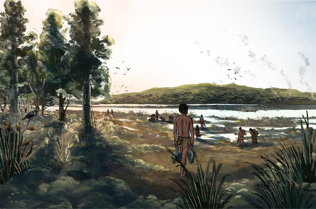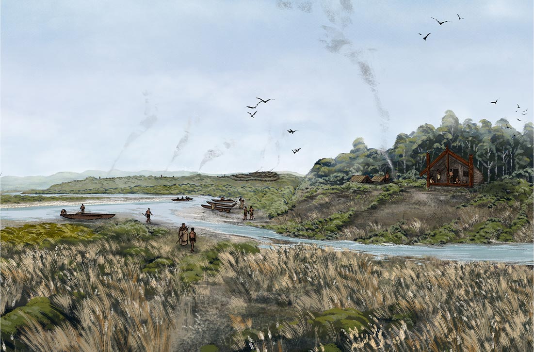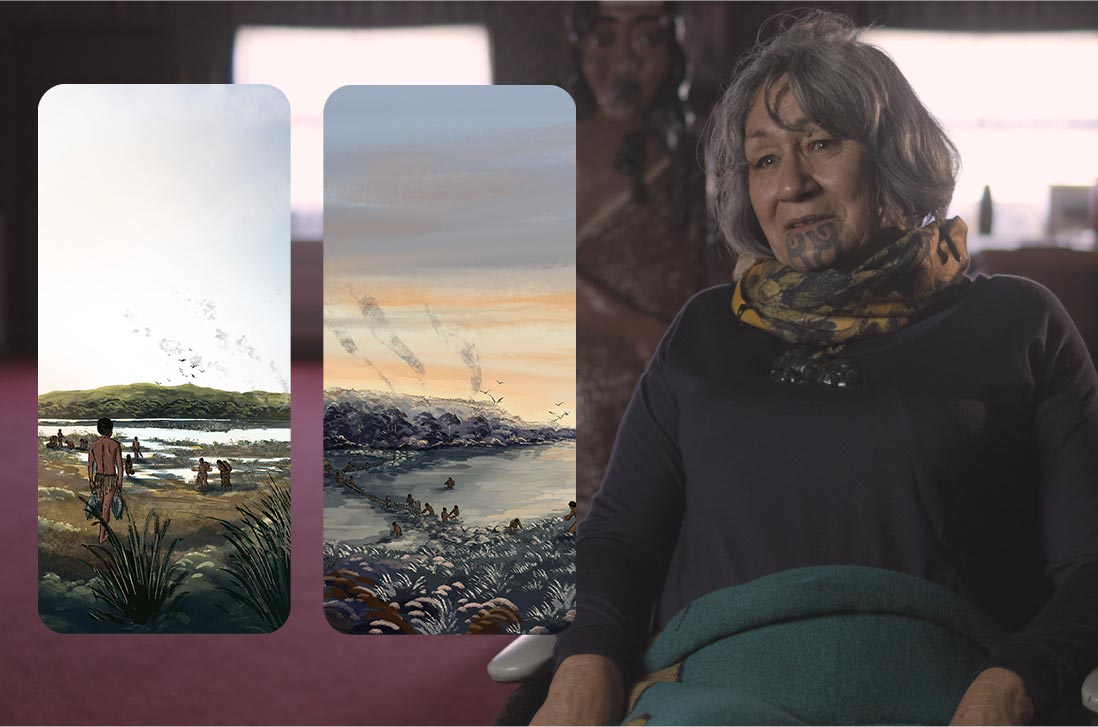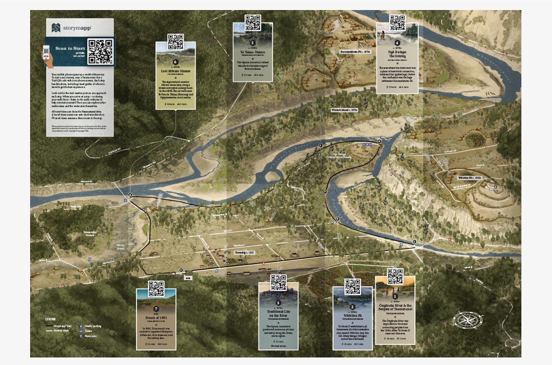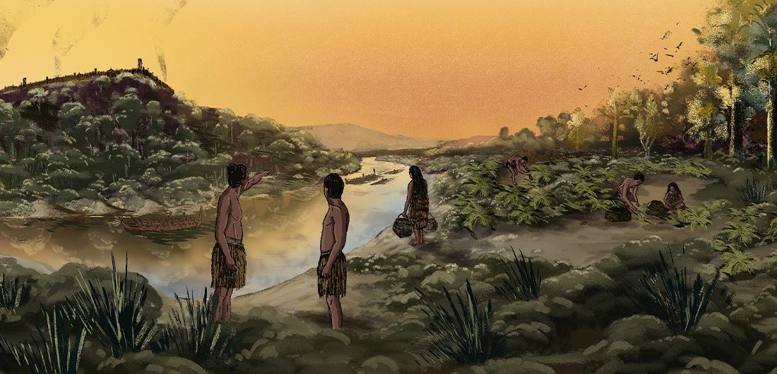 The Storymapp® features a bespoke illustration of Taumarunui, as it would have looked when the tūpuna (ancestors) lived there. Modern streets have been overlaid for wayfinding purposes.