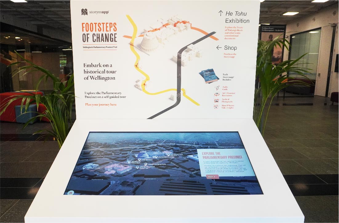The initial release of the project involved creating a mobile tour, an interactive trailhead kiosk at Tākina convention centre, and a brochure map. The second release features a Storymapp®, mana whenua oral history interviews on the mobile guide, and a second trailhead at the National Library of New Zealand.